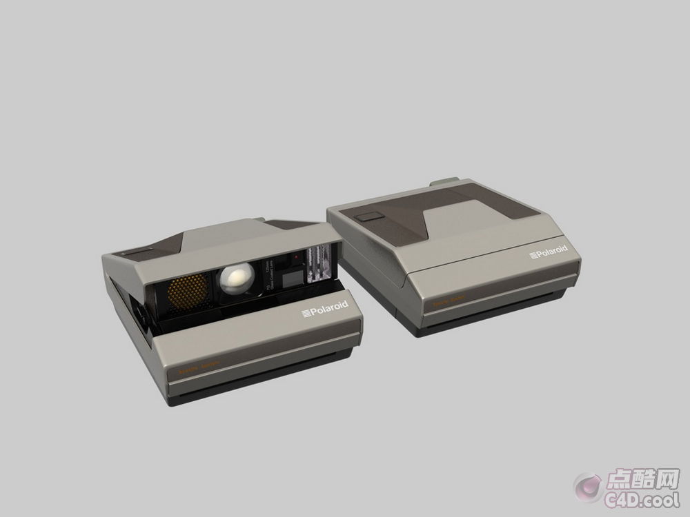 这套 C4D 模型工程展示了两台宝丽来(Polaroid)品牌的即时成像相机。相机主体呈银灰色,设计风格偏向复古,具有浓厚的怀旧气息。一台相机处于打开状态,露出内部的镜头、闪光灯及胶片仓等结构,另一台则是闭合状态。