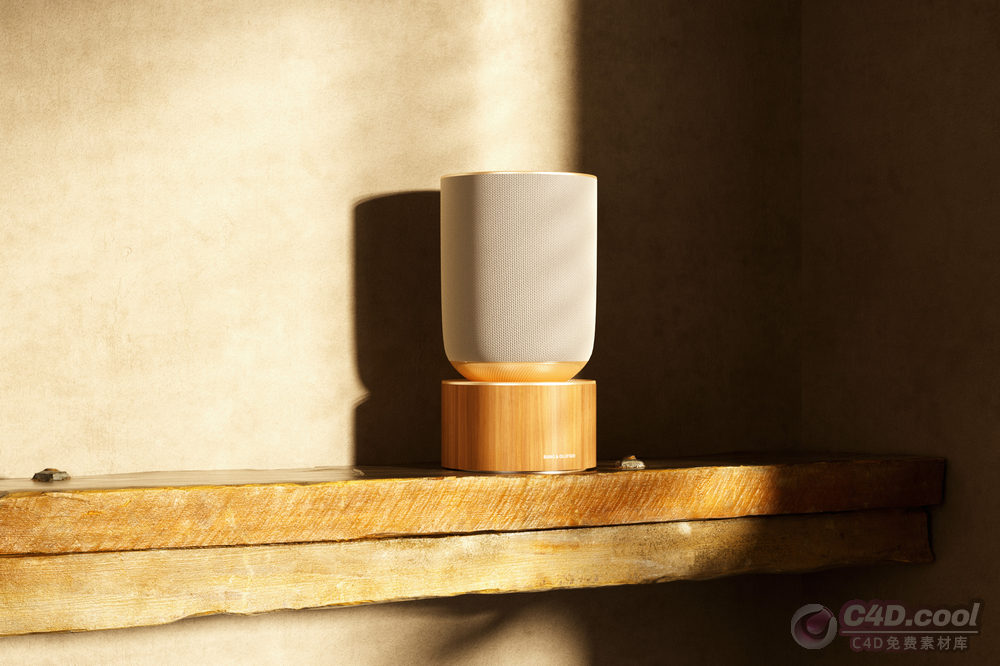 关键词:C4D模型、OC渲染、数码产品、白色音箱、木质底座、木质台面、米色墙面、产品展示模型。