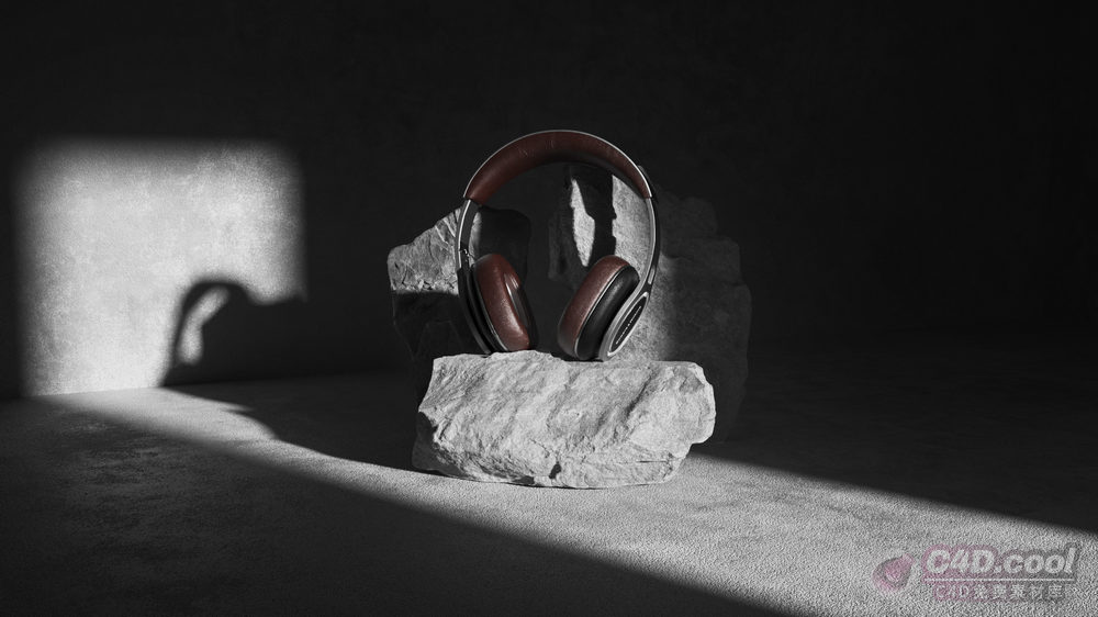 关键词:C4D模型、OC渲染、数码产品、头戴式耳机、灰色石块、深色空间、产品展示模型