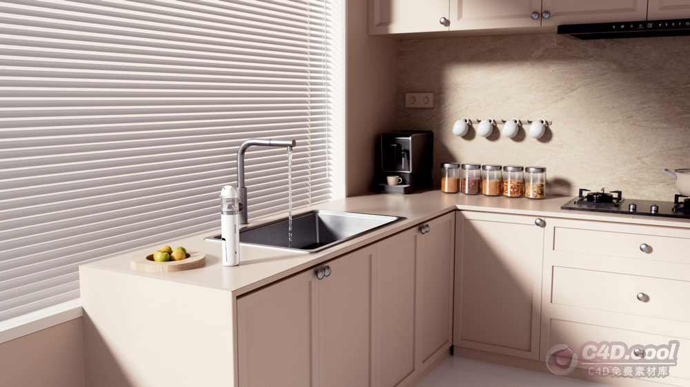 这是运用C4D建模并通过OC渲染的模型工程,呈现出整洁的厨房场景。工程包含的物品有:白色设备(从外观推测属于小型家电或电子设备类目,具备特定功能)、米色厨房橱柜(设计实用,提供储物空间)、黑色水槽与水龙头(属于厨具类目,具备洗涤功能)、黑色咖啡机(属于家电类目,具备制作咖啡功能)、玻璃罐(用于收纳,丰富场景层次)、木质砧板与水果(含青柠,增添生活气息)、白色百叶窗(调节光线,完善场景布局)、厨具(含灶台,适配厨房场景)。各元素经精细建模与渲染,还原了设备、家电、厨具的材质肌理、家具的木质质感及空间的光影层次,适用于家电、厨具品牌宣传、厨房场景设计参考等场景。