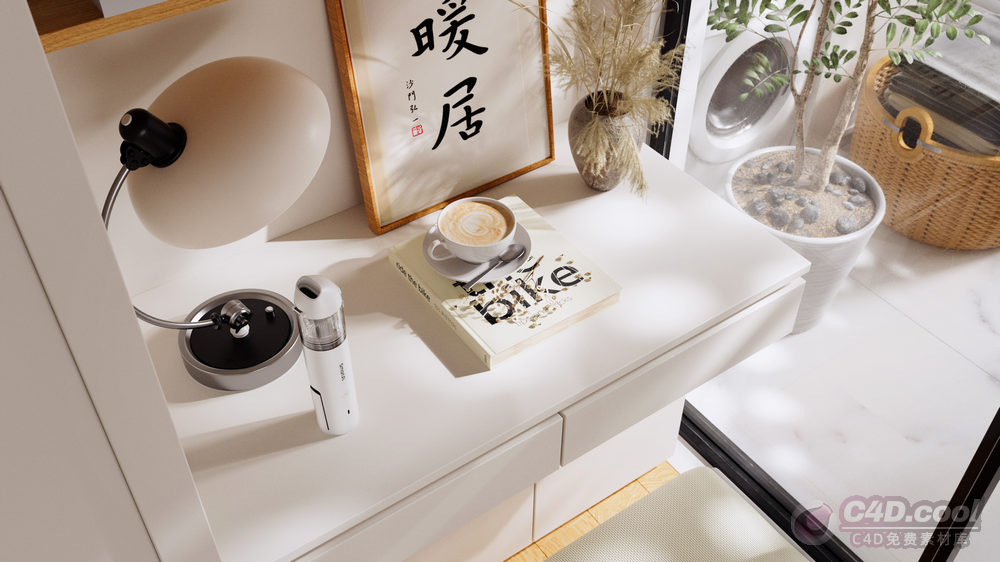 这是运用C4D建模并通过OC渲染的模型工程,呈现出雅致的居家场景。工程包含的物品有:白色设备(从外观推测属于小型家电或电子设备类目,具备特定功能)、白色边柜(设计简约,提供置物空间)、黑色台灯(属于家电类目,具备照明功能)、装饰画(含“暖居”字样,增添文化气息)、书籍与咖啡杯(丰富场景层次,营造生活氛围)、植物装饰(含干花与绿植,提升场景美感)、白色地面(质感整洁,衬托整体场景)。各元素经精细建模与渲染,还原了设备、家电的材质肌理、装饰的细节及空间的光影层次,适用于家电或电子设备品牌宣传、居家场景设计参考等场景。
