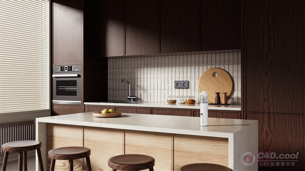关键词:C4D模型、OC渲染、家电、白色设备、黑色烤箱、深色橱柜、中岛台、模型