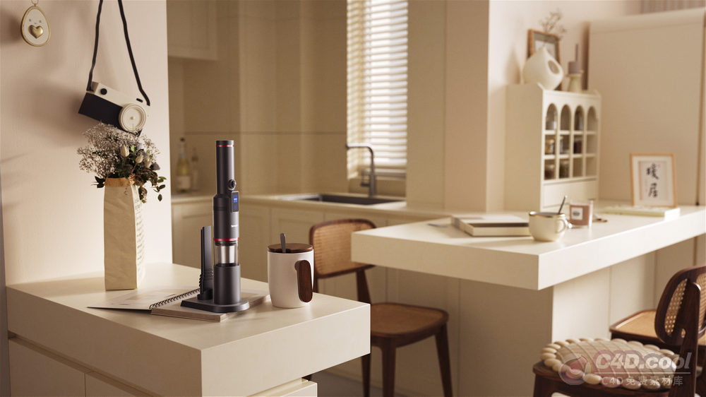 关键词:C4D模型、OC渲染、家电、手持吸尘器、白色中岛台、棕色座椅、花卉装饰、模型