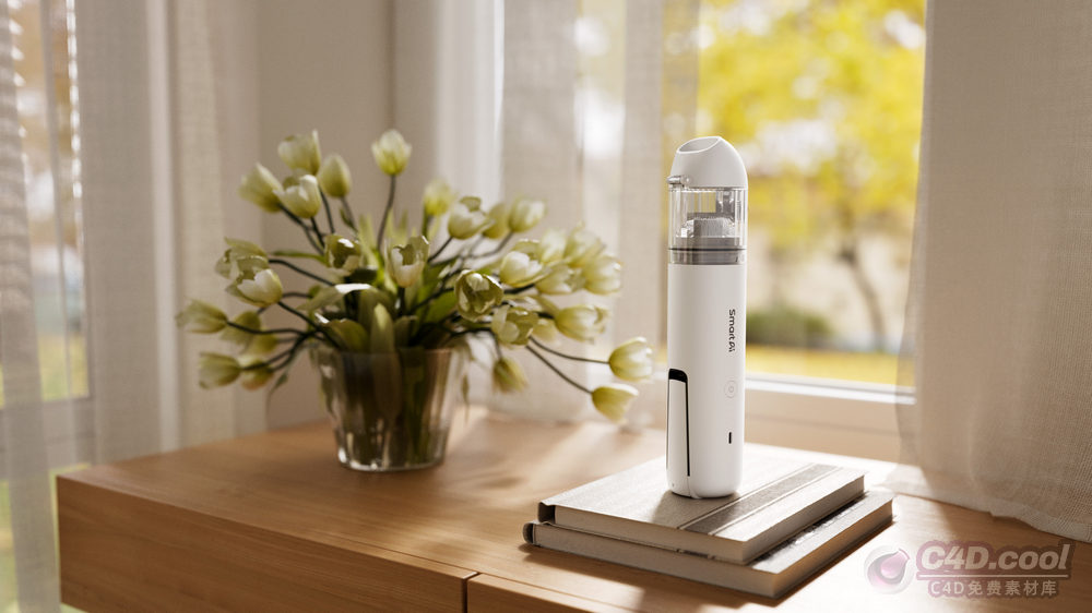 这是运用C4D建模并通过OC渲染的模型工程,呈现出雅致的居家场景。工程包含的物品有:白色设备(从外观推测属于小型家电或电子设备类目,具备特定功能)、木质边桌(纹理自然,提供置物空间)、花卉装饰(含白色郁金香与玻璃花瓶,增添自然气息)、书籍(堆叠摆放,丰富场景层次)、白色窗帘(色调柔和,调节光线)、窗外景观(含树木,优化场景氛围)。各元素经精细建模与渲染,还原了设备的材质肌理、家具的木质质感及空间的光影层次,适用于家电或电子设备品牌宣传、居家场景设计参考等场景。