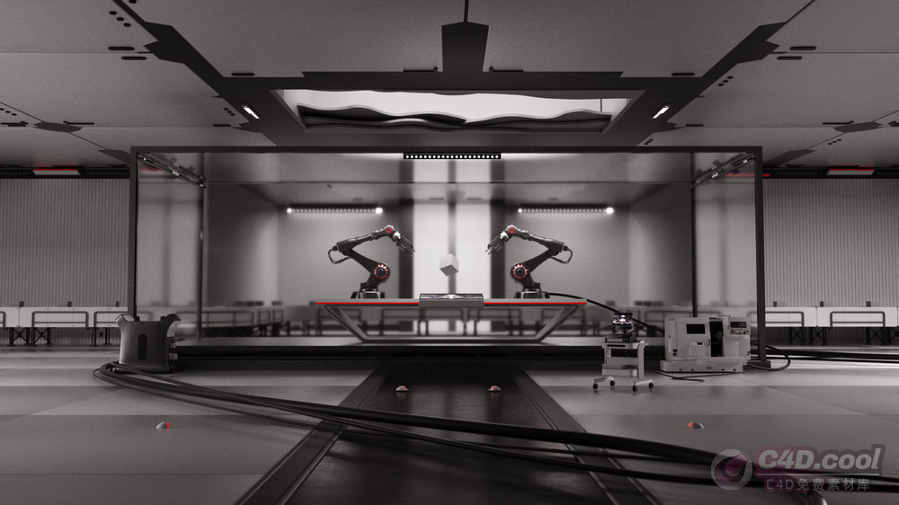 这是运用C4D建模并通过OC渲染的模型工程,呈现出极具科技感的工业场景。工程包含的物品有:工业机械臂(属于工业设备类目,具备自动化作业功能)、大型工业厂房结构(设计规整,提供作业空间)、轨道与线缆(保障设备运行,完善场景布局)、工业控制台与设备(满足工业生产需求,强化场景属性)、黑白灰主色调环境(突出科技感,优化视觉层次)。各元素经精细建模与渲染,还原了工业设备的金属质感、厂房的空间结构及场景的光影层次,适用于工业设备品牌宣传、工业场景设计参考等场景。