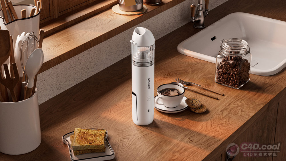 这是运用C4D建模并通过OC渲染的模型工程,呈现出精致的厨房场景。工程包含的物品有:白色设备(从外观推测属于小型家电或电子设备类目,具备特定功能)、木质厨房台面(纹理自然,提供操作空间)、白色马克杯(属于日用品类目,具备饮水功能)、咖啡罐与咖啡豆(含咖啡器具,增添生活气息)、吐司与托盘(含餐食,丰富场景层次)、厨具收纳筒与餐具(含勺子,满足厨房使用需求)、水槽与窗户(调节光线,优化场景氛围)。各元素经精细建模与渲染,还原了设备的材质肌理、家具的木质质感及空间的光影层次,适用于家电或电子设备品牌宣传、厨房场景设计参考等场景。