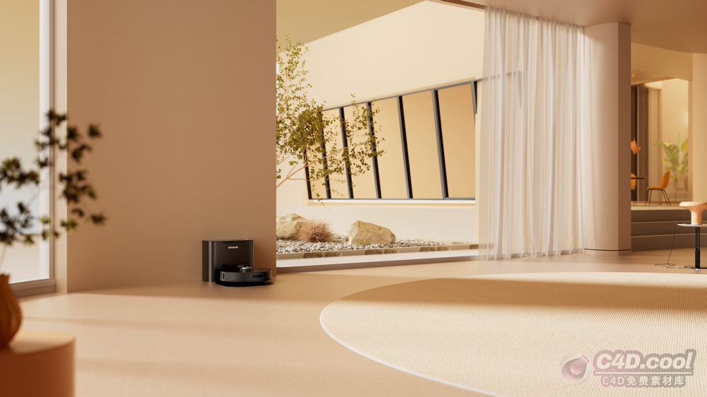 这是运用C4D建模并通过OC渲染的模型工程,呈现出极具设计感的居家场景。工程包含的物品有:黑色圆形设备(属于家电类目,具备清洁功能)、浅米色墙面与地面(色调柔和,营造空间氛围)、白色窗帘(调节光线,优化场景层次)、景观区域(含树木与石块,增添自然气息)、木质摆件与花卉装饰(丰富视觉层次,强化居家属性)、多区域空间结构(拓展场景维度,完善布局)。各元素经精细建模与渲染,还原了家电的材质肌理、空间的光影层次及场景的设计感,适用于家电品牌宣传、居家场景设计参考等场景。