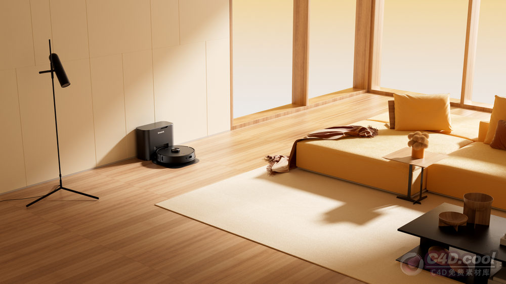 这是运用C4D建模并通过OC渲染的模型工程,呈现出雅致的居家场景。工程包含的物品有:黑色圆形设备(属于家电类目,具备清洁功能)、黄色布艺沙发(质感柔软,营造休憩氛围)、木质茶几(纹理自然,提供置物空间)、米色地毯(提升场景舒适度,完善布局)、黑色落地灯(属于家电类目,具备照明功能)、宠物(增添生活气息,丰富视觉层次)、木质地板与浅米色墙面(色调柔和,衬托整体场景)、大窗户(调节光线,优化场景氛围)。各元素经精细建模与渲染,还原了家电的材质肌理、家具的布艺与木质质感及空间的光影层次,适用于家电品牌宣传、居家场景设计参考等场景。