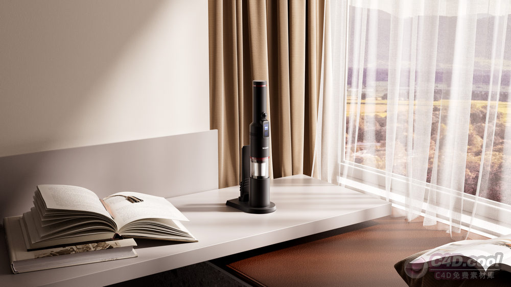 这是运用C4D建模并通过OC渲染的模型工程,呈现出雅致的居家场景。工程包含的物品有:黑色设备(从外观推测属于小型家电或电子设备类目,具备特定功能)、浅灰色置物台(设计简约,提供置物空间)、书籍(含翻开的读物,丰富场景层次)、酒瓶(属于日用品类目,具备储酒功能)、米色窗帘(调节光线,优化场景氛围)、大窗户与窗外景观(含自然景色,衬托整体场景)、木质桌面(纹理自然,拓展场景维度)。各元素经精细建模与渲染,还原了设备的材质肌理、空间的光影层次及场景的雅致感,适用于家电或电子设备品牌宣传、居家场景设计参考等场景。