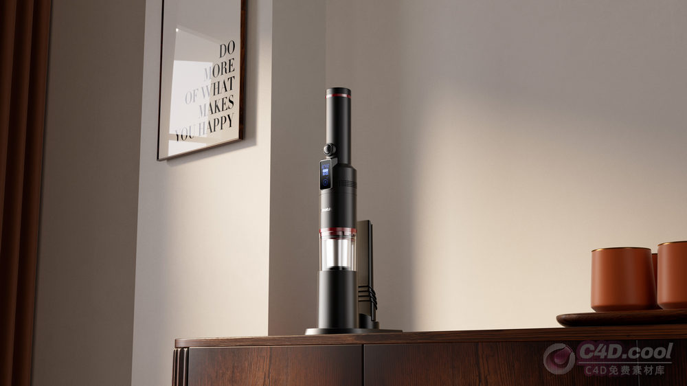 这是运用C4D建模并通过OC渲染的模型工程,呈现出精致的居家场景。工程包含的物品有:黑灰色设备(属于家电类目,具备清洁功能)、木质柜子(纹理自然,提供置物空间)、装饰画(含文字内容,丰富视觉层次)、棕色杯具(属于日用品类目,具备收纳功能)、浅米色墙面(色调柔和,衬托整体场景)、灯光(营造氛围感,优化场景层次)。各元素经精细建模与渲染,还原了家电的材质肌理、家具的木质质感及空间的光影层次,适用于家电品牌宣传、居家场景设计参考等场景。