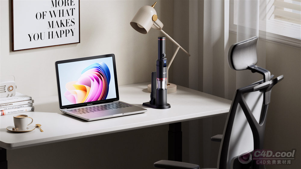 这是运用C4D建模并通过OC渲染的模型工程,呈现出整洁的办公场景。工程包含的物品有:黑灰色设备(属于家电类目,具备清洁功能)、白色笔记本电脑(属于电子设备类目,具备计算与显示功能)、白色台灯(属于家电类目,具备照明功能)、白色办公椅(设计人体工学,提供坐靠功能)、白色马克杯(属于日用品类目,具备饮水功能)、书籍(堆叠摆放,丰富场景层次)、装饰画(含文字内容,增添场景格调)、白色桌面(质感简洁,衬托整体场景)、窗帘与窗户(调节光线,优化场景氛围)。各元素经精细建模与渲染,还原了设备、电子设备、家电的材质肌理、日用品的质感及空间的光影层次,适用于家电、电子设备品牌宣传、办公场景设计参考等场景。