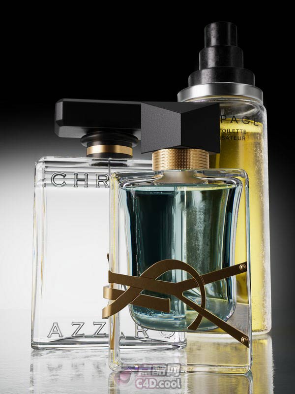 这是化妆品类的模型工程。画面中有三瓶香水,左侧香水瓶身透明,瓶盖黑色,瓶身刻有 “CHR AZZAR” 字样;中间香水瓶为透明玻璃材质,瓶身有金色装饰环,内装蓝绿色液体;右侧是喷雾瓶,瓶身透明,内装黄色液体,瓶盖黑色。