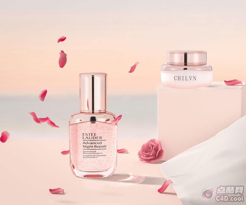 这是化妆品类的模型工程。画面中有一瓶雅诗兰黛的 “Advanced Night Repair” 精华,瓶身透明,内含粉色液体,瓶盖为银色。旁边有一罐 CHILVN 品牌的护肤品,罐子呈粉色。背景为柔和的渐变色,有玫瑰花瓣飘落,还有一朵真实的玫瑰花和一块白色布料,营造出浪漫氛围。