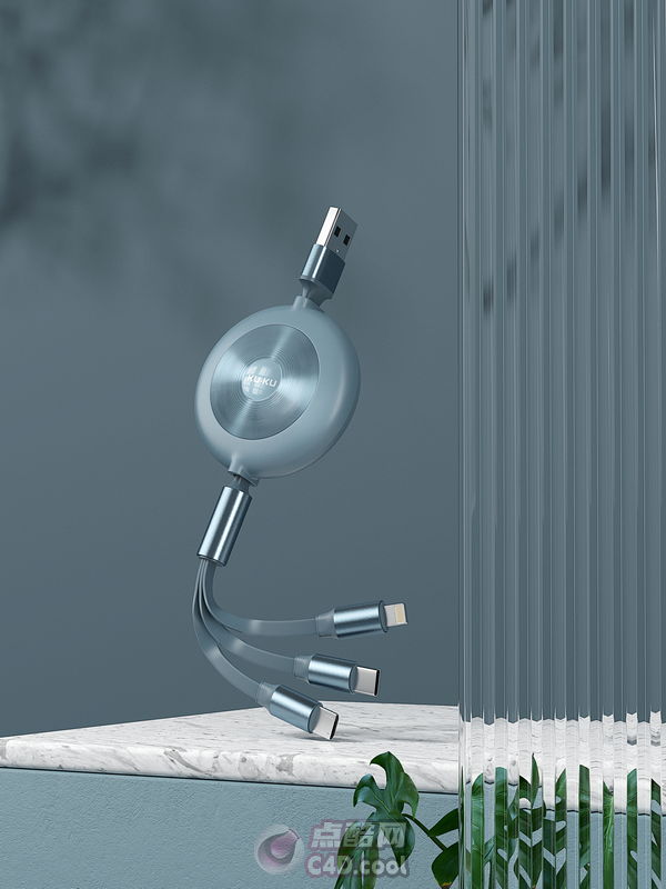 这是电子产品配件类的模型工程。画面主体是一款多功能伸缩数据线,主体为浅灰色圆形,带有品牌标识。数据线分出三个不同接口,分别为 USB、Type – C 和 Lightning 接口。数据线放置在一个大理石台面上,旁边有一株绿色植物,背景为灰色调.