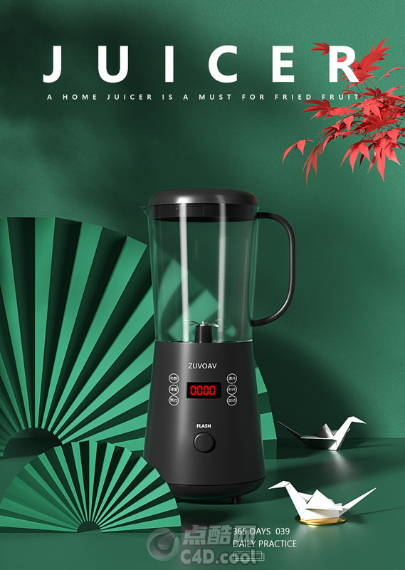 这是家电类的模型工程。画面中央是一台黑色的ZUVOAV品牌榨汁机,榨汁机带有透明杯体,黑色底座,底座上有操作按钮和显示时间为“00,00”的显示屏。背景为绿色,有扇形图案装饰,右上角有红色枫叶,右下角有两个纸鹤装饰,上方有白色“JUICER”字样及英文文案。