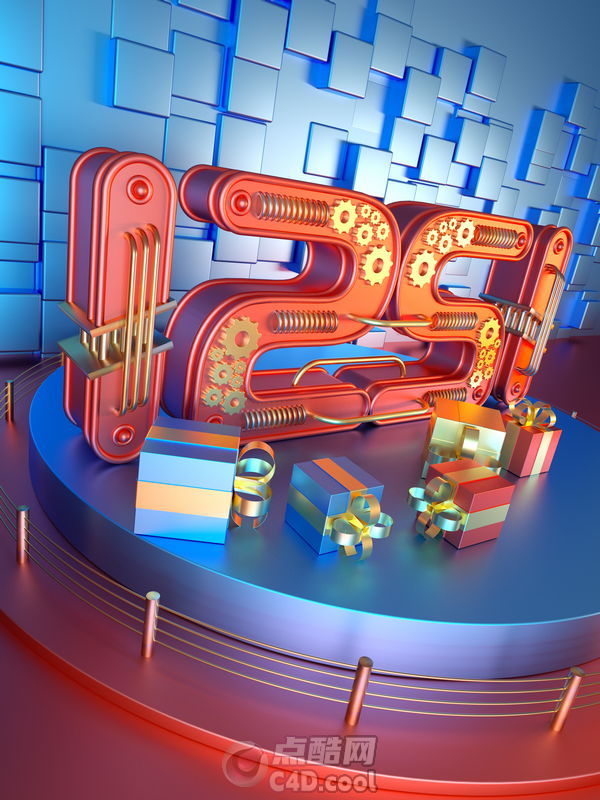 这是展示类模型工程。画面中心是一组造型独特的立体数字 “125”,数字为红色,带有齿轮,弹簧等机械元素,呈现出工业风。数字下方的圆形平台上摆放着多个色彩鲜艳的礼盒,礼盒带有金色装饰。背景是由蓝色方块组成的墙面,整体营造出一种庆典或促销的氛围。