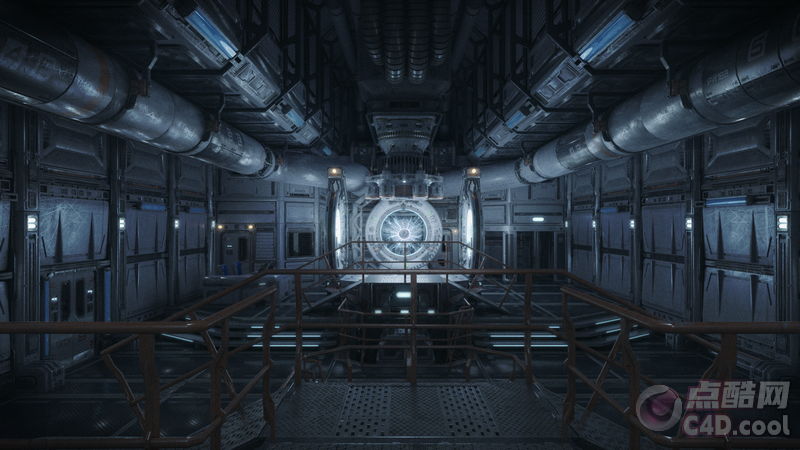 这是一幅科幻风格的场景图。画面展现了一个类似飞船或高科技设施的内部空间。四周是灰暗色调的金属墙壁与结构,有着复杂的线路和面板。画面中央有一个巨大的透明装置,似乎是某种能量核心或观察窗口,散发着光亮,给人一种神秘且充满科技感的氛围。