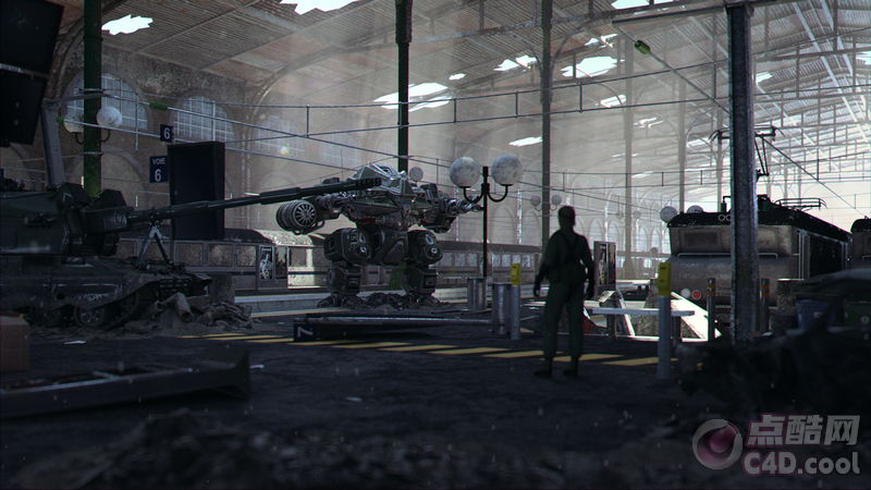 此C4D模型工程展示了一个破败的工业厂房场景。厂房顶部有多处破损,光线透过缝隙洒入。画面中央有一个大型的机械机器人,其外观布满金属部件和机械结构。机器人旁边有一辆老式的火车车厢,车厢表面锈迹斑斑。前景处有一位身着深色服装的人物,背对着镜头站立。厂房内地面脏乱,还散落着一些杂物。