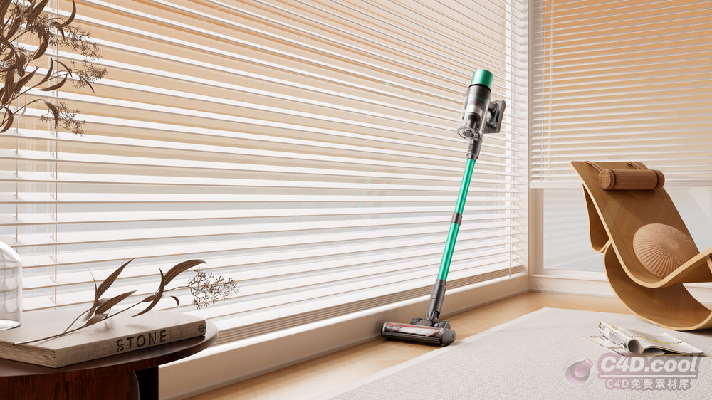 这是运用C4D建模并通过OC渲染的模型工程,呈现出雅致的居家场景。工程包含的物品有:绿黑色设备(属于家电类目,具备清洁功能)、米色布艺沙发(质感柔软,营造休憩氛围)、木质边桌(设计简约,提供置物空间)、植物装饰(含干枝元素,增添自然气息)、白色百叶窗(调节光线,优化场景氛围)、浅色地毯(提升场景舒适度,完善布局)、浅米色墙面(色调柔和,衬托整体场景)。各元素经精细建模与渲染,还原了家电的材质肌理、家具的布艺与木质质感及空间的光影层次,适用于家电品牌宣传、清洁设备展示等场景。