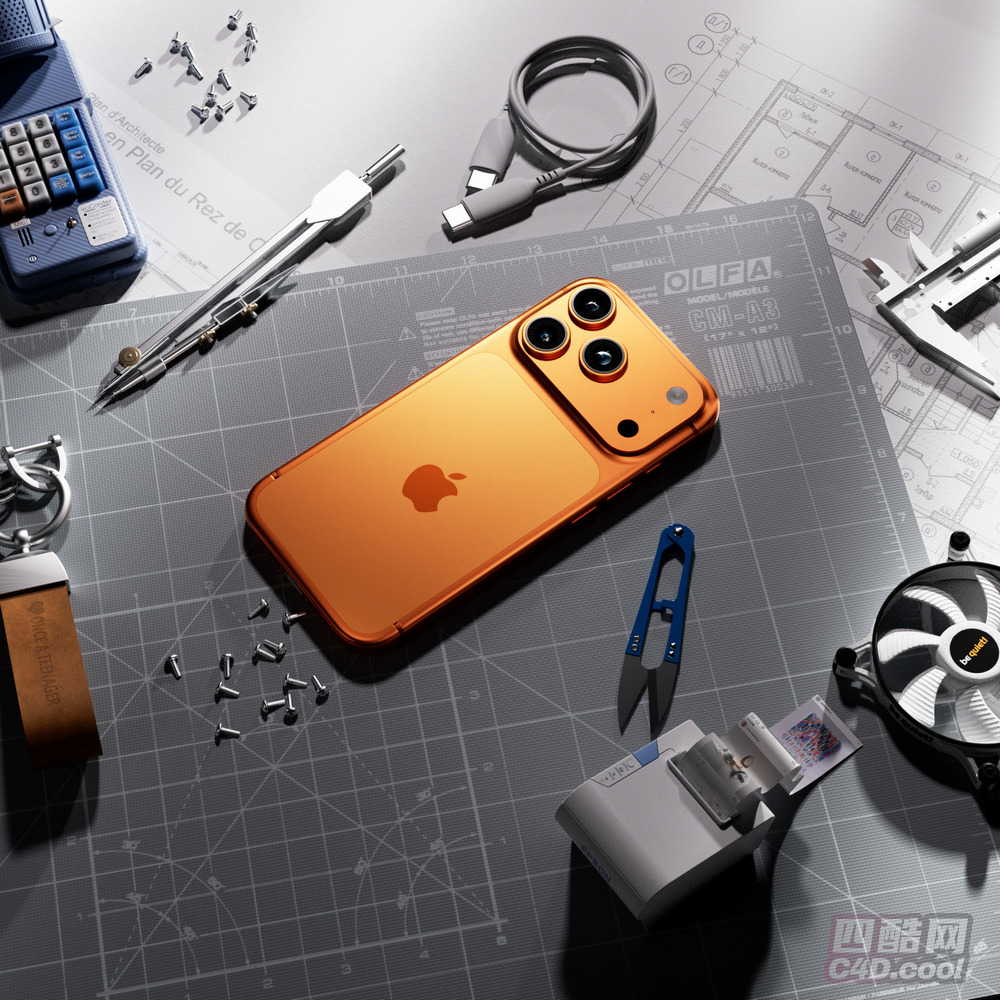 这套C4D模型工程运用OC渲染技术,打造出以金色 iPhone 17 Pro(属于通讯工具、智能手机类目)为核心的场景。模型里,iPhone 17 Pro置于带有刻度的OLFA切割垫上;周围有蓝色计算器、金属圆规、USB-C 数据线、散落的金属螺丝、带皮革挂件的钥匙扣、蓝色小剪刀、正在出片的小型照片打印机、电脑散热风扇,背景还有印着建筑户型图的图纸。各物品建模精细,材质与光影渲染真实,便于通过 “手机”“iPhone 17 Pro”“计算器”“圆规”“数据线”“螺丝”“钥匙扣”“剪刀”“打印机”“风扇”“切割垫” 等关键词检索,可用于数码产品展示、设计场景还原等视觉创作。