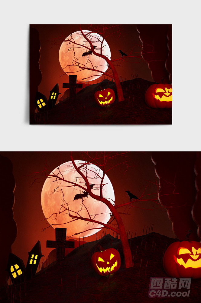 四酷网-万圣节-暗色调万圣节明月夜景主题C4D创意场景