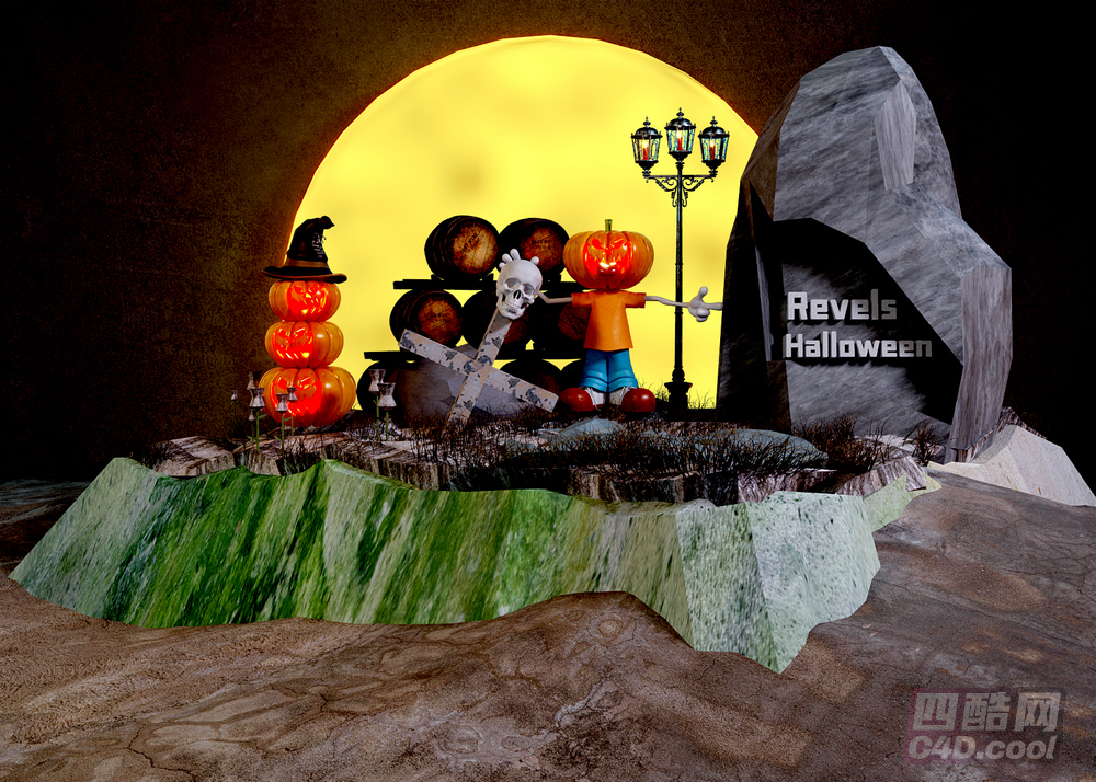 四酷网-万圣节-C4D创意万圣节乱石岗恐怖南瓜创意场景