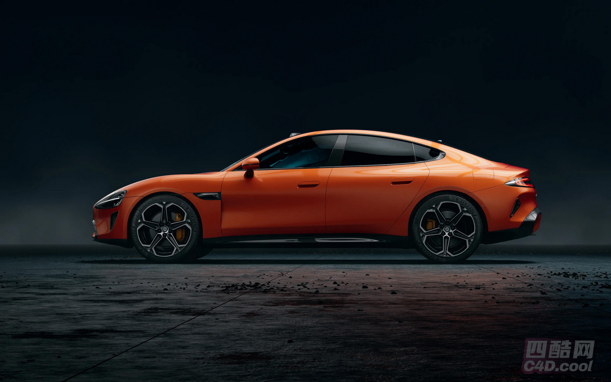 3D 建模、小米 SU7、橙色车身、轿跑车型、流线设计、五辐轮毂、运动卡钳、现代车灯、轿跑风格、工业设计、电动汽车、科技感、视觉呈现、C4D 建模、汽车模型、动感造型、细节精致、未来感、办公素材(四酷网)、渲染效果