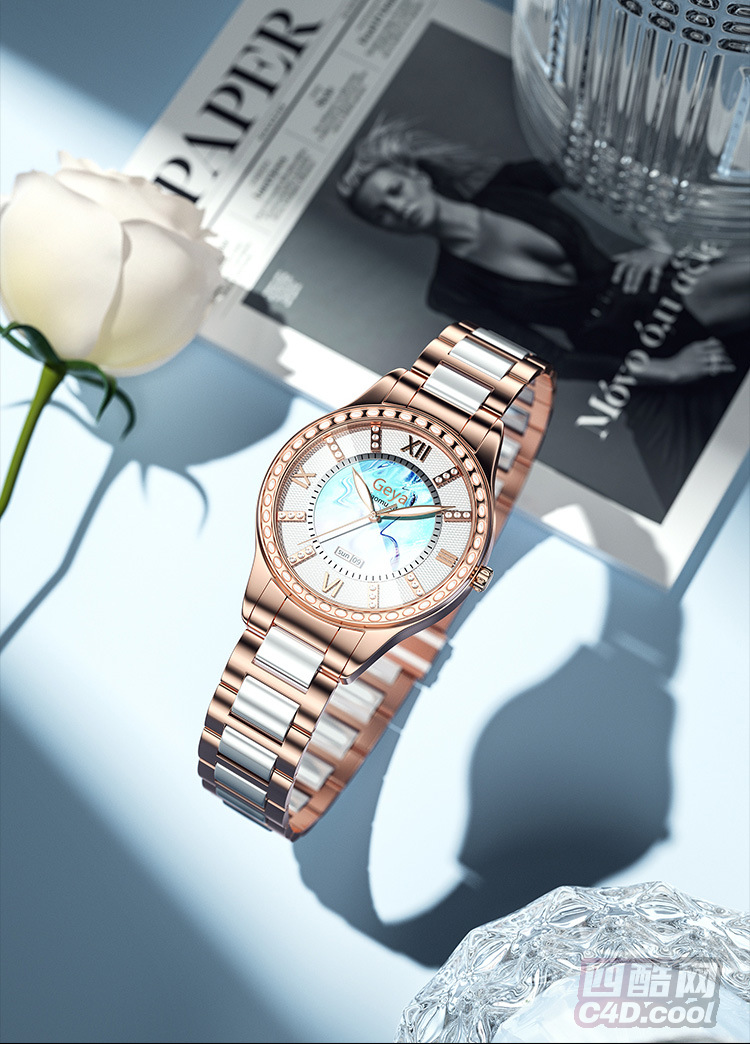 这是一个通过 C4D 建模并采用 Octane(OC)渲染的手表模型工程。该物品属于钟表类目,具体为手表(wristwatch)。模型中包含女士腕表主体,其具有玫瑰金与银色相间的表带、镶嵌装饰的表圈、带有罗马数字刻度和品牌标识的表盘;场景部分涵盖白色玫瑰花、时尚杂志(带有人物图像与文字元素)、透明玻璃器皿、水晶质感摆件以及光影营造的环境场景。整套模型工程在细节呈现上十分出色,腕表的金属质感、表带的拼接设计、表盘的纹理与装饰,以及场景中各物品的材质(如玫瑰的花瓣质感、杂志的纸张纹理、玻璃器皿的透明反光、水晶摆件的折射效果)都通过 C4D 建模与 OC 渲染得到了逼真还原,为手表产品展示提供了高品质的视觉方案。
