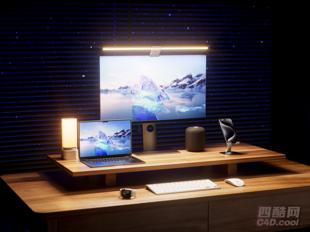 是一个通过C4D建模并采用Octane(OC)渲染的数码桌面场景工程。该工程涵盖多个数码产品及家居类目物品,核心包含显示器(monitor)、笔记本电脑(laptop)、手机(mobilephone)、手机支架(phonestand)、智能音箱(smartspeaker)、键盘(keyboard)、鼠标(mouse)、智能手表(smartwatch)、桌面台灯(desklamp)、显示器挂灯(monitorlightbar)以及木质书桌(woodendesk)、百叶窗背景(blinds)等。