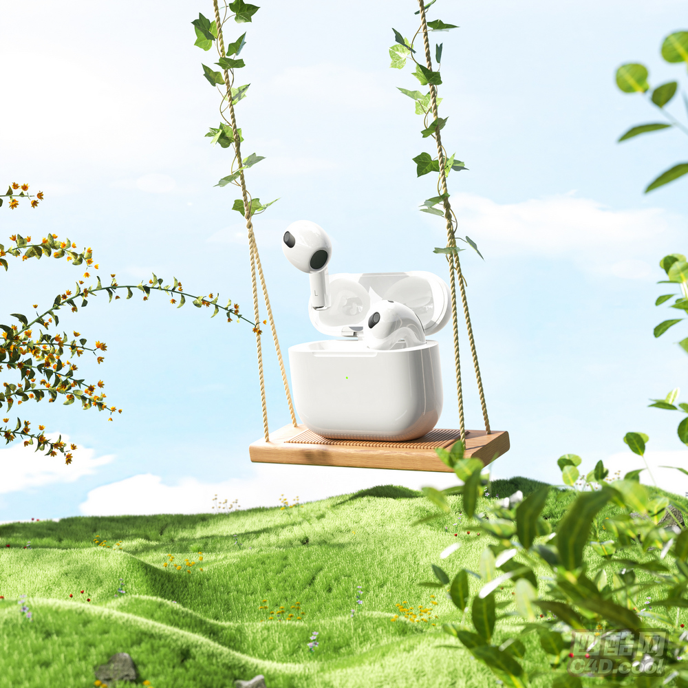模型中,无线耳机的细节表现出色,耳机的外观设计、充电盒的质感与指示灯等,均通过C4D建模与OC渲染精准还原;场景物品的材质也十分细腻,木质秋千的木纹、藤蔓的缠绕形态、草地的植被层次、开花植物的花朵细节、天空的渐变效果等,共同营造出清新自然的户外场景,为无线耳机产品的展示提供了高品质的视觉方案,适用于音频产品的创意宣传、电商推广等场景。