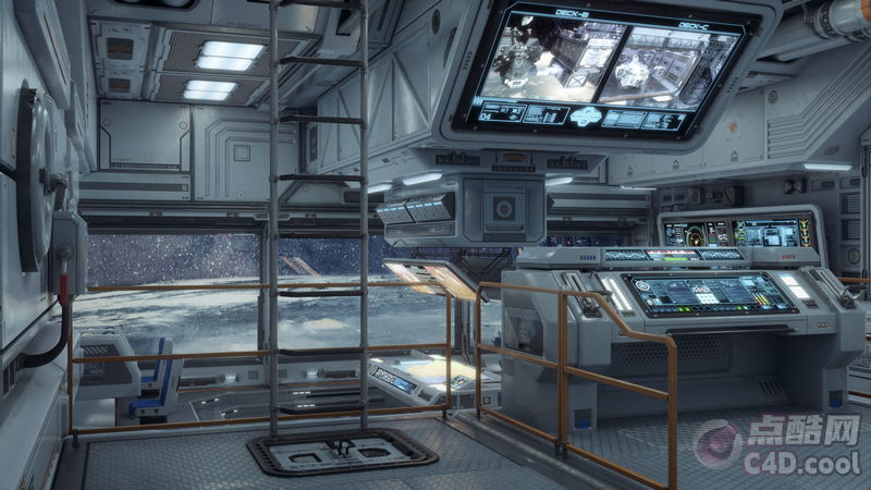 此C4D模型工程展示了一个未来风格的太空舱控制室。室内布满各种高科技设备,前方有多个显示屏,显示着不同信息。操作台上分布着各类按钮,仪表盘和控制装置,两侧有蓝色座椅。舱壁上有通风口,管道和标识,如“SOLARO3”等,整体充满科技感。