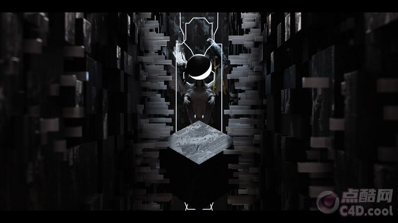 此C4D模型工程呈现出一个神秘且充满科技感的场景。画面中心有一个形似人物的雕塑,头部为球形,雕塑周围环绕着类似机械飞鸟的物体。雕塑前方有一个菱形的透明体,内部似乎有图案。背景和四周是由黑色方块组成的复杂结构,营造出深邃,神秘的氛围。