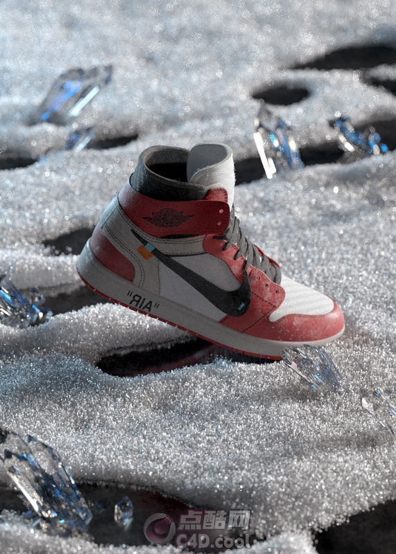 此C4D模型工程展示了一只放置在特殊环境中的运动鞋。这只运动鞋以红白黑三色为主,鞋面上有品牌标志和“RIA”字样等细节。它被置于一片类似覆盖着冰霜或细雪的表面上,周围散落着一些透明的晶体,整体营造出一种冷峻,时尚的氛围。