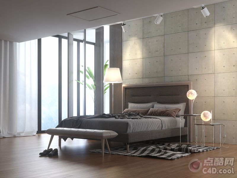 此C4D模型工程展示了一间现代风格卧室。房间内有一张灰色大床,床上铺着灰色床单和棕色枕头,床尾有一个浅灰色长凳。床两侧各有一个床头柜,上面摆放着球形台灯。床头背景是灰色水泥墙,窗边有落地灯和绿植,地板为木质,整体简约舒适。