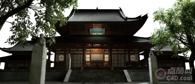 此C4D模型工程呈现了一座中式传统建筑。建筑为多层结构,具有典型的飞檐翘角,屋顶覆以黑色瓦片。建筑正面有木质门窗,门上挂有牌匾,牌匾上有文字。门前有台阶,台阶两侧有石制雕像,建筑周围有绿树环绕,整体展现出古朴典雅的风格。
