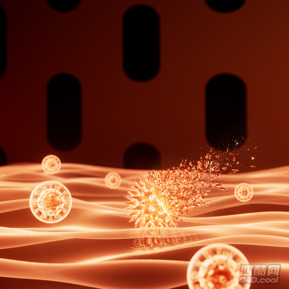 模型中,病毒的细节表现出色,病毒的形态结构(刺突、包膜等)、破坏时的粒子特效等,均通过C4D建模与OC渲染精准还原;细胞结构的纹理与层次也十分细腻,共同营造出微观生物医疗展示场景,为病毒研究、生物医疗科普等提供了高品质的视觉方案,适用于医疗科研展示、生物知识科普等场景。