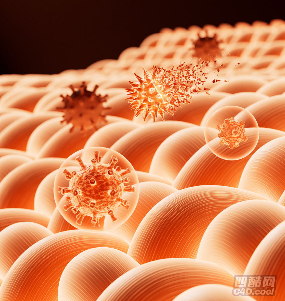 模型中,病毒的细节表现出色,病毒的形态结构(刺突、包膜等)、破坏时的粒子特效等,均通过C4D建模与OC渲染精准还原;细胞结构的纹理与层次也十分细腻,共同营造出微观生物医疗展示场景,为病毒研究、生物医疗科普等提供了高品质的视觉方案,适用于医疗科研展示、生物知识科普等场景。