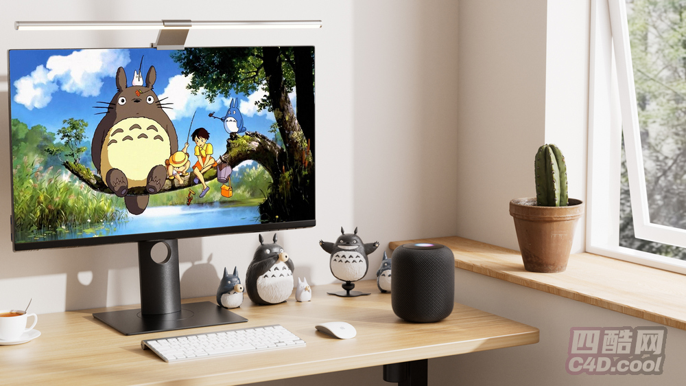 四酷网C4D-OC渲染工程含显示器键盘鼠标智能音箱龙猫摆件木质书桌咖啡杯仙人掌盆栽窗户桌面灯