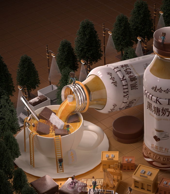 此C4D模型工程呈现了一个充满趣味的微缩场景。画面中有一瓶倾斜的“娃哈哈黑糖奶茶”饮料瓶,瓶口正往一个白色大杯子里倒出奶茶,杯子里有黑糖块和茶包。杯子周围有多个小人偶,有的在爬梯子,有的在搬运物品。场景中还有一些小房子,树木,路灯等建筑和景物。
