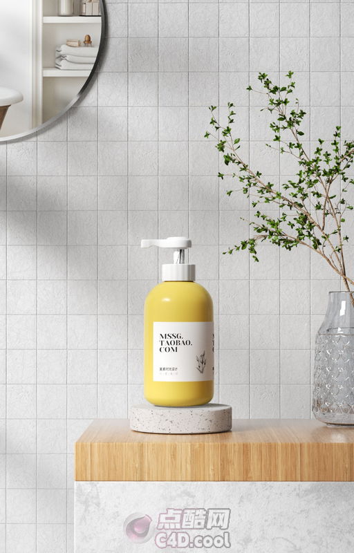 此C4D模型工程呈现了一个浴室场景。画面中央是一瓶黄色的护肤品,瓶身有白色的泵头,瓶身标签上有“MISSG.TAOBAO.COM”等字样。瓶子放置在一个木质台面上的白色圆石底座上。台面右侧有一个透明的玻璃花瓶,里面插着几枝绿色植物。背景是白色瓷砖墙,左上角有一面圆形镜子,镜子里反射出部分浴室景象。