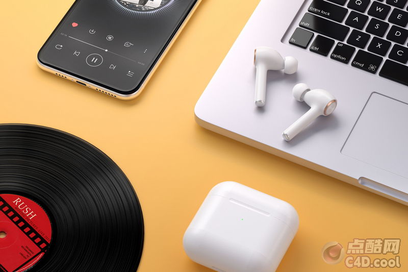 这是一个使用C4D软件建模,OC渲染器渲染的模型工程。模型场景包含多种物品。首先是一部智能手机,屏幕显示音乐播放界面,属于通讯工具,电子产品。旁边是一台笔记本电脑,呈现打开状态,属于办公设备,电子产品。画面中有一对白色的真无线蓝牙耳机及其充电盒,属于音频设备,数码配件。还有一张黑胶唱片,唱片标签上有“RUSH”字样,属于音乐载体。这些物品被放置在一个暖黄色的背景上,整体营造出数码与音乐结合的氛围。