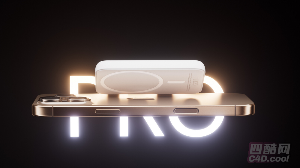 这是一个通过C4D建模并采用Octane(OC)渲染的数码配件场景工程。该工程属于数码配件类目,包含无线充电宝(数码配件)、智能手机、发光文字元素(“PRO”造型)、渐变背景等物品。
