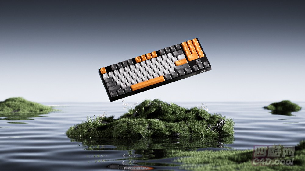 模型中,havit品牌机械键盘的细节表现出色,键盘的键帽配色(灰、白、橙)、键帽纹理、品牌标识、键盘壳体材质等,均通过C4D建模与OC渲染精准还原;水域场景的效果也十分细腻,水面的波纹质感、植被小岛的形态与纹理、光影层次等,共同营造出极具艺术感的数码配件展示场景,为机械键盘的外观设计展示、产品推广提供了高品质的视觉方案,适用于数码电商推广、外设设备营销等场景。