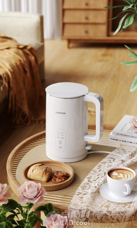 这是运用C4D软件建模,并通过OC渲染器渲染的模型工程。模型展示的主体是一个白色的电热水壶,属于家电类目,品牌为“LANTERN”。电热水壶放置在一个木质的圆形茶几上,壶身正面有操作按钮和功能标识。茶几上还有一盘面包和饼干,旁边是一杯带有拉花的咖啡,咖啡杯下有蕾丝餐布。茶几边缘摆放着几朵粉色的玫瑰花。背景中可以看到一张铺有棕色毯子的沙发,沙发旁边有一盆绿色植物,后方还有一个木质的柜子。整个模型营造出温馨,舒适的居家氛围,为家电产品展示提供了贴近生活的三维场景资源。