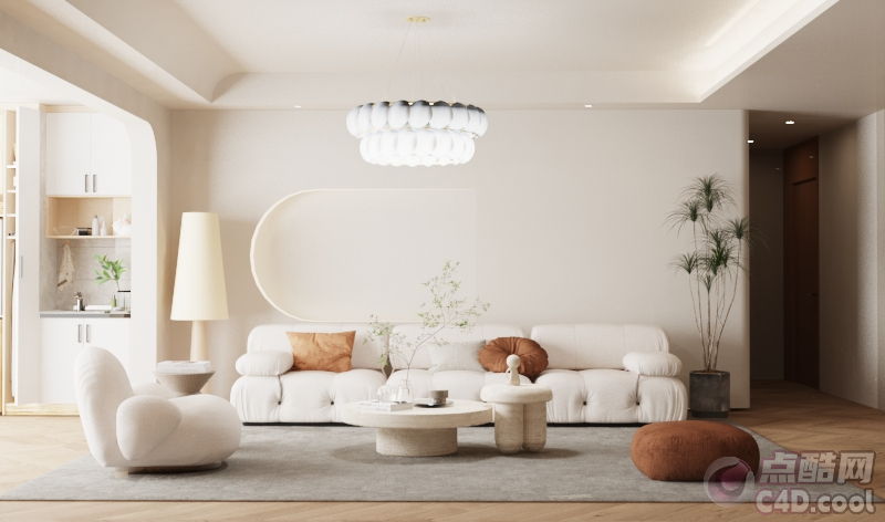 这是运用C4D软件进行建模,并通过RS(Redshift)渲染器渲染的模型工程。模型展示了一个温馨且现代的客厅场景。主体是一组白色的沙发,属于家具类目,沙发上摆放着几个抱枕,包括橙色和棕色的圆形抱枕,还放置了一条白色的毯子。沙发前方有两张圆形的茶几,材质似大理石,茶几上摆放着书籍、杯子、花瓶以及绿植等物品。沙发左侧有一把白色的造型圆润的单人椅,旁边的小圆桌上放置着一盏白色的台灯。沙发后方的墙上有一个弧形的装饰。房间中央悬挂着一盏独特的吊灯,右侧有一株高大的绿植,旁边还有一个棕色的圆形坐垫。左侧背景处可看到部分白色的橱柜,橱柜上摆放着一些装饰品和绿植。整个模型为家具展示提供了舒适且美观的三维场景资源。
