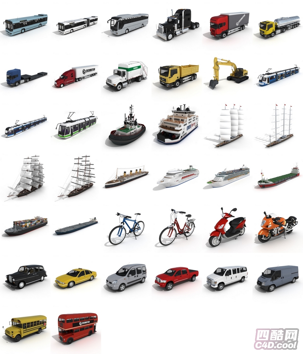 • 公路车辆类:巴士(含铰接巴士)、重型卡车(含油罐车、货车、拖车)、工程车(挖掘机、垃圾车)、轿车、皮卡、面包车、自行车、电动踏板车、燃油摩托车