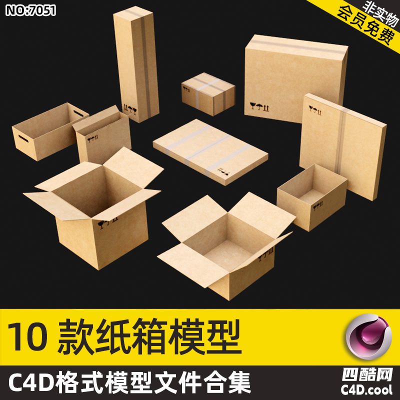 这个 C4D 模型是10 款纸箱模型合集,包含的物品(对应模型)有: