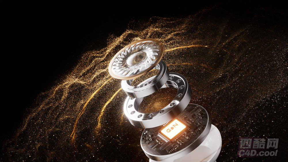模型中,核心组件的细节表现出色,透明扇叶的纹理、金属壳体的材质质感、电路板的电路细节、芯片的发光标识等,均通过C4D建模与OC渲染精准还原;金色粒子特效的动态效果、渐变背景的光影层次也十分细腻,共同营造出极具科技感的数码设备结构展示场景,为核心组件的技术展示、数码产品性能科普等提供了高品质的视觉方案,适用于数码工程展示、电子设备营销等场景。