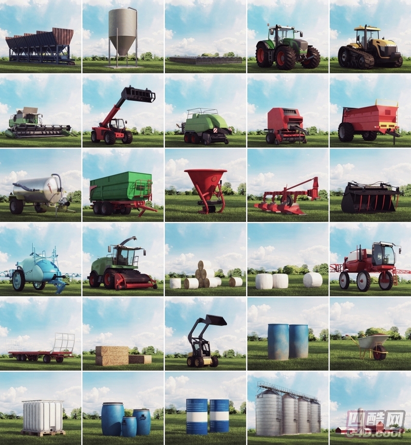 这个 C4D 模型是农业设备与农用设施合集,包含的物品(对应模型)有: