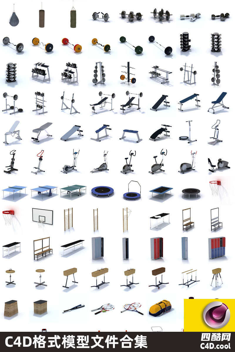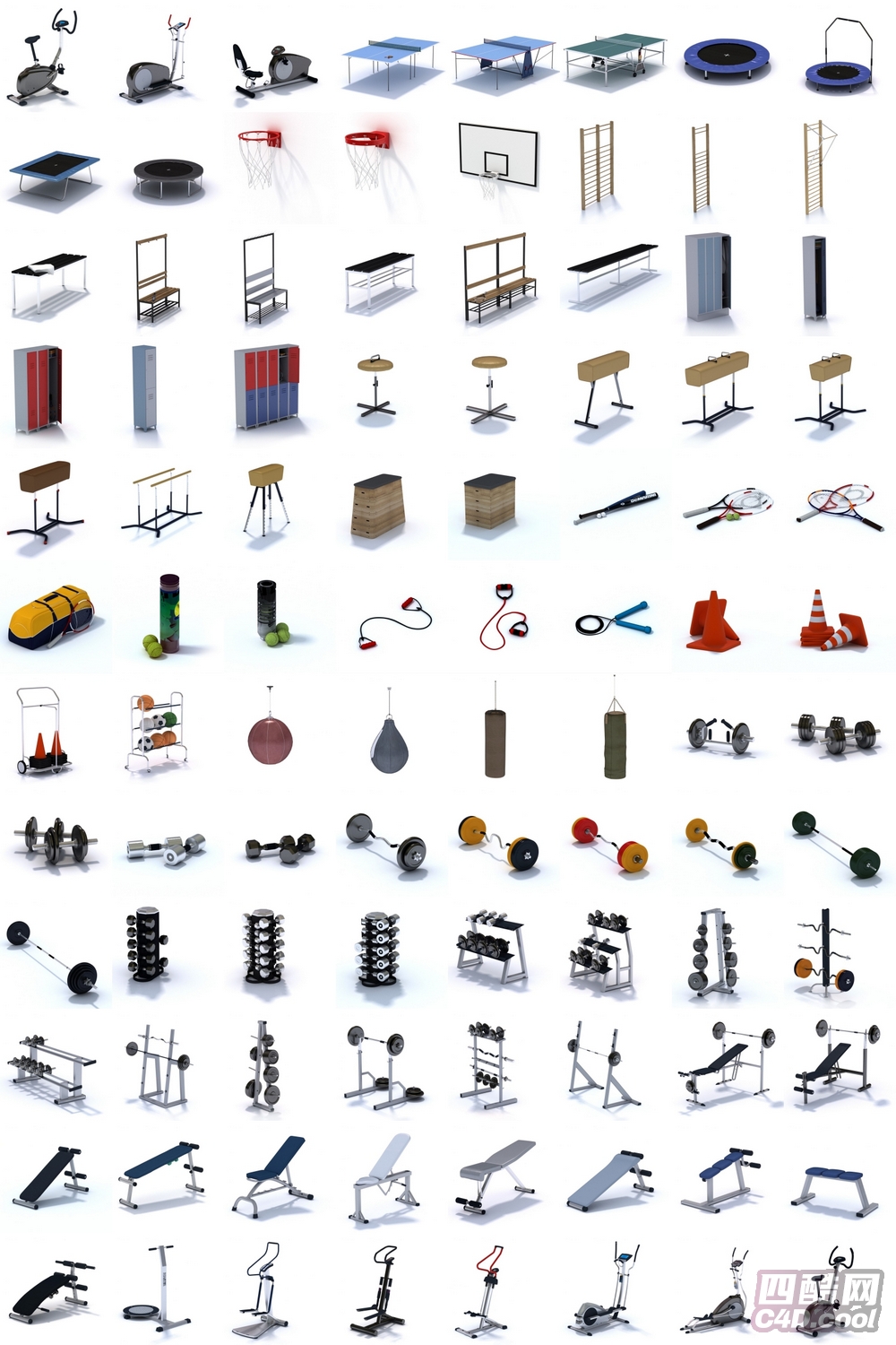 这个 C4D 模型是运动健身与体育器材合集,包含的物品(对应模型)有: